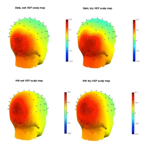 The dry and gelled recordings were also compared on their performance regarding VEP morphology and topography. As shown in the overlay plot in Figure 5 and in Figure 6, the waveforms for dry and gelled electrodes were qualitatively similar.