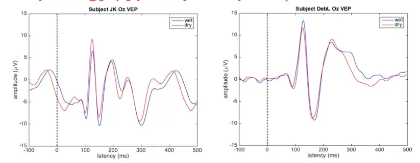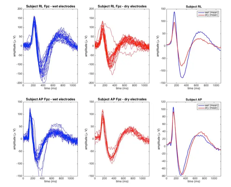 P1 amplitude was also similar for wet and dry cap preparations, with mean values of 11.95 μV and 11.35 μV for wet and dry electrodes, respectively. No statistically significant difference in P1 amplitude could be detected between the wet and dry cases (p=0.29; twotailed, paired t-test).